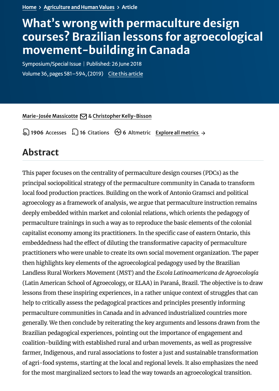 Massicotte, MJ., Kelly-Bisson, C. What’s wrong with permaculture design courses? Brazilian lessons for agroecological movement-building in Canada. Agriculture and Human Values 36, 581–594 (2019).